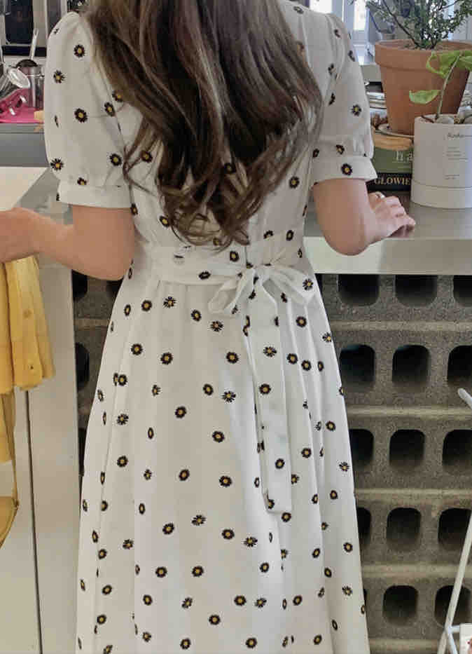 デイジーフラワーパターンでラブリーなムード溢れるロングワンピースです♡軽くて柔らかな肌に優しい素材感で快適に着られます。ラップスタイルのVネックデザインで鎖骨をキレイに演出し、華奢なシルエットを完成させます♪ボリュームを与えるパフショルダーで二の腕をカバーし、高めにマークされたウエストラインでスリムに見せ脚長効果も◎ロングな着丈感で体型カバーはもちろん、両サイドのストラップでポイントを与えました:)